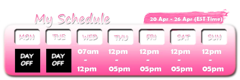 Snuskprat, Erotisk dans, Blottning, Fot Fetisch, Dildo eller Vibrator, Anal, Fingrar, Dubbel penetration, Doggy style, Ansiktssittande, Runkningsinstruktion, Onani, Orgasm, Sexleksaker, Peggning, Striptease, Twerk, Topless, Bröstknull, Smiskning